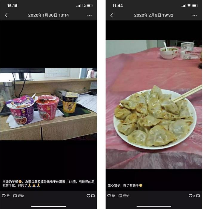 面对这样的压力,在收到我们送去的水饺时,看到她朋友圈的信息,写道“爱心饺子,吃了有劲干”,把方便面叫大餐。