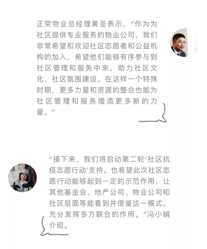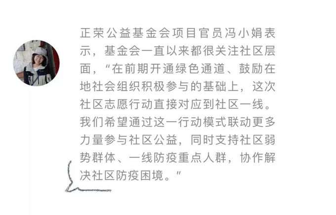 冯小娟介绍,社区抗疫正荣志愿行动小组由社区物业志愿者牵头发起,成员包括物业、业委会、居委会、公益组织从业人员以及社区志愿者等,项目具体执行由在地公益机构承担。基金会将对执行机构提供三万元以内的小额资助,同时安排工作人员与各执行机构一一沟通,协助机构进行项目设计和执行,确保项目的专业性和公益性。