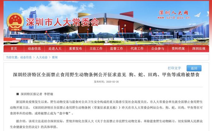 2月25日,深圳市人大官网发布《深圳经济特区全面禁止食用野生动物条例(草案征求意见稿)》,根据条例草案,为了坚决革除滥食野生动物的陋习,从源头上控制重大公共卫生风险,保障公众身体健康与生命安全,深圳市人大常委会率先就全面禁止食用野生动物开展立法。