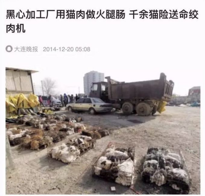 2016年成都商报的记者暗访以爱猫人士为幌子的贩卖猫肉的店家,据说利益链已持续十几年,将猫肉伪装兔肉售卖。