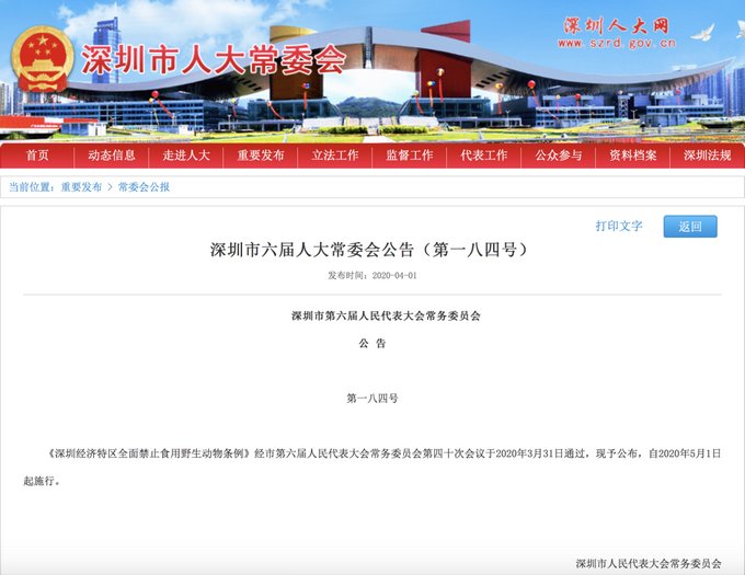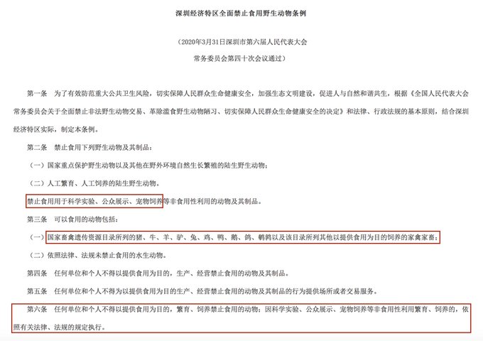 2020年3月31日,深圳六届人大常委会第四十次会议通过《深圳经济特区全面禁止食用野生动物条例》。(以下简称为《条例》)