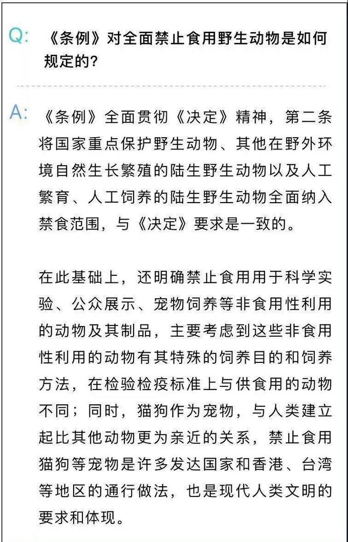 在今年3月31日表决通过的《条例》中明确规定:禁止食用用于科学试验、公众展示、宠物饲养等非食用性利用的动物及其制品。