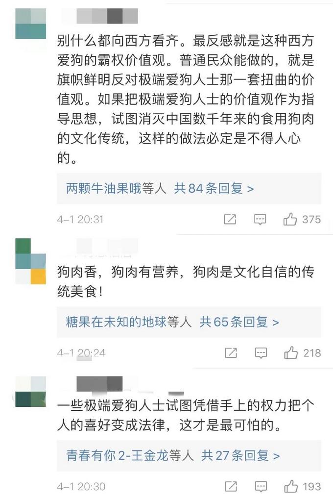 不过网络上仍然有少数反对的声音。如“食用狗肉”是中国数千年来的文化传统、纯粹是个人喜好等等。