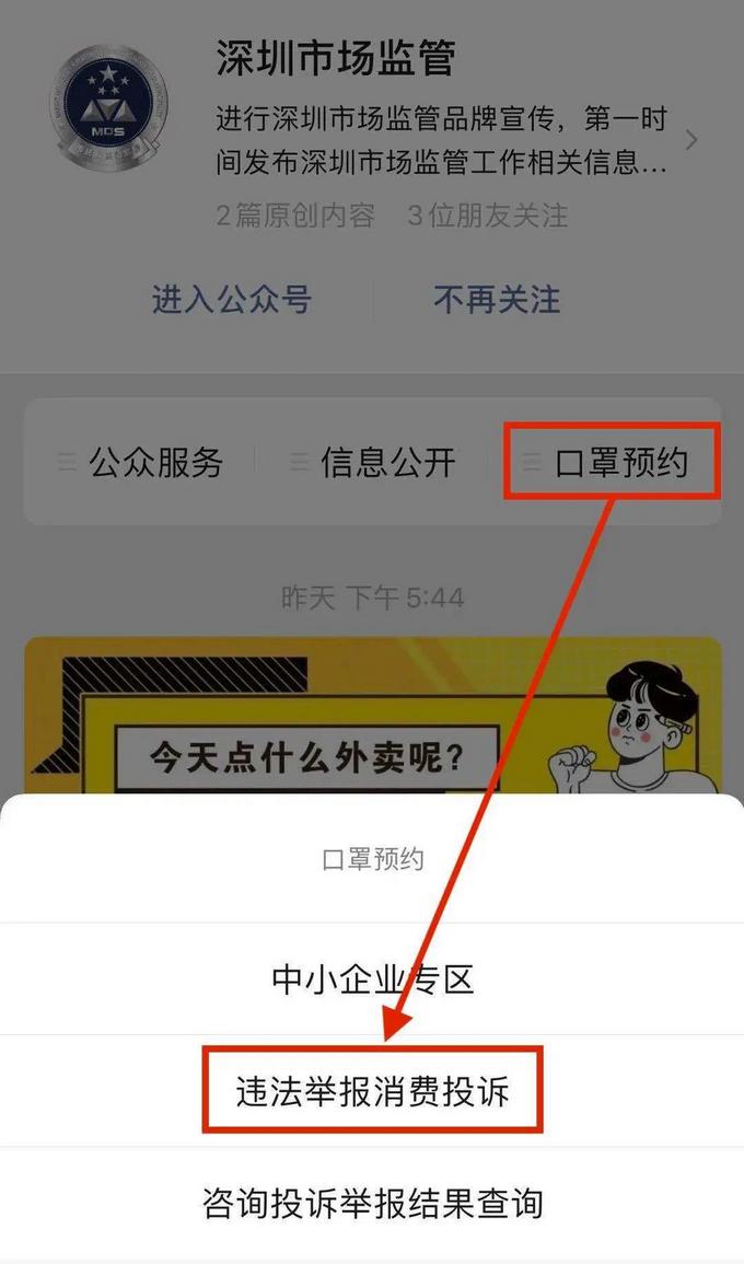 1、关注公众号“深圳市场监管”,点开最右侧【口罩预约】-【违法举报消费投诉】提交投诉/举报内容即可。