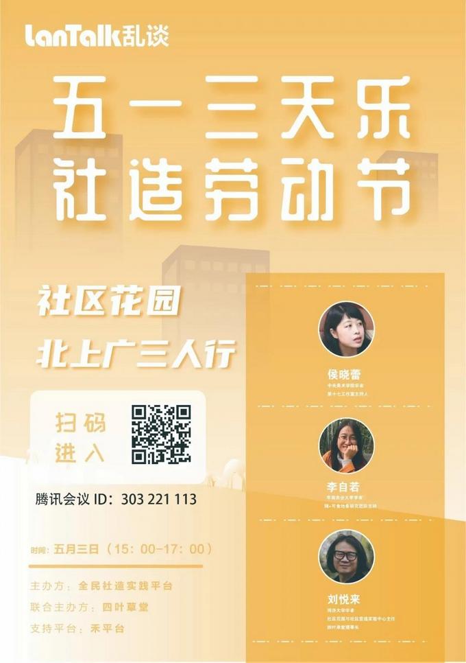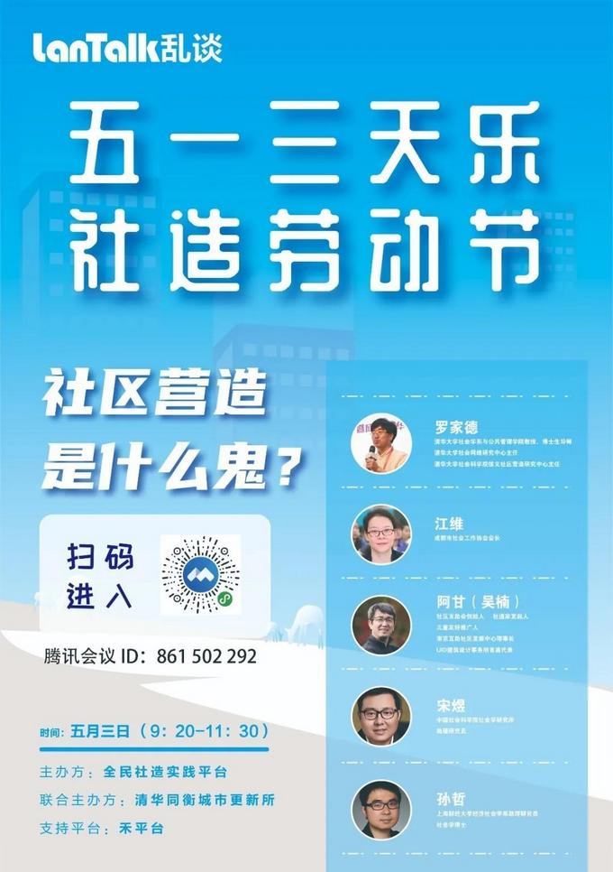 今年五一社造劳动节,5月3到5日,社区营造&社区发展微信群发起的“全民社造实践平台发起三天的讨论会【LANTALK】,LANTALK取意Local Area Network,演讲者们将为大家带来社区营造的故事和经验。