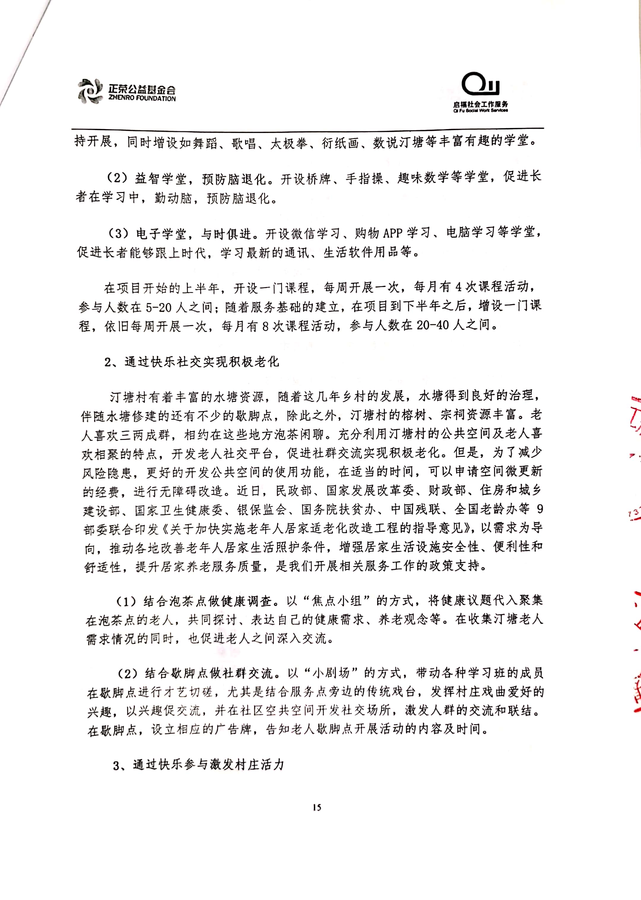 “乐居汀塘”汀塘村居家养老服务项目由林越集团、正荣集团、正荣公益基金会于2020年联合发起,委托福建省启福社会工作服务中心具体执行。项目计划围绕汀塘村老年人的身、心、社、灵全人健康维度,透过专业化服务手法整合辖区多方资源,回应老人日益增长的多元化养老需求,提升老人居家养老幸福感,打造“健康、快乐、安居”的汀塘。立项合作协议及项目方案如下: