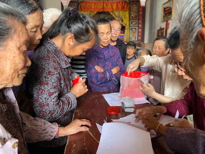 三月底,生气勃勃充满活力的春天,莆田汀塘村焕发着别样的生机,汀塘正荣福寿金发放现场热热闹闹的。