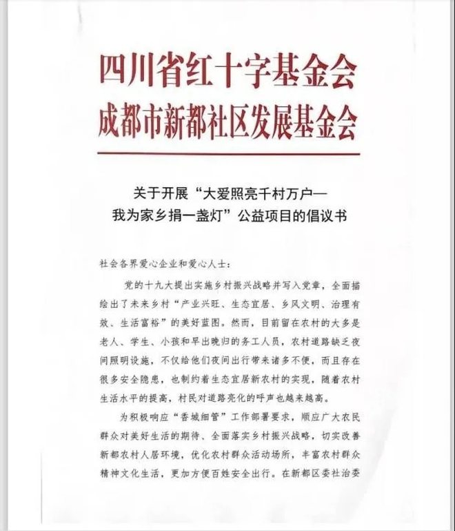 为了顺应广大老百姓们对美好生活的期待,全面落实乡村振兴战略,切实改善和优化群众的活动场所,更加方便老百姓安全出行。在新都区委社治委的指导下,新都社区发展基金会与四川省红十字基金会共同发起开展“大爱照亮千村万户——我为家乡捐一盏灯”公益项目。用实际行动打通乡村亮化的最后“一公里”,让爱照亮回家的路。