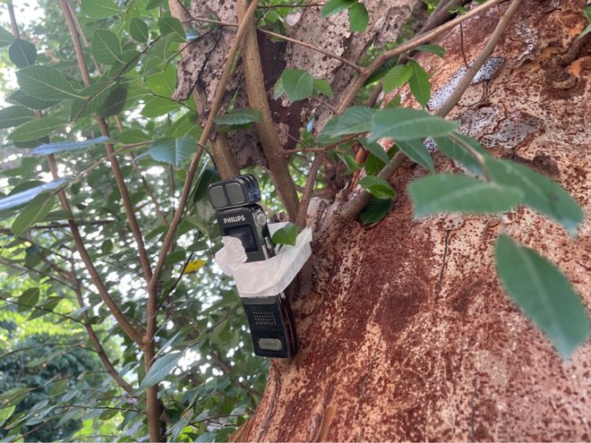 我从这个点出发开始实验和深化。然后偶然之间,我把录好的一段蝉鸣对着树调到最大声播放,发现树上的蝉也会跟着这段录音开始鸣叫。我觉得这个互动行为隐喻了很多层意思,定下了这个作品的基调。