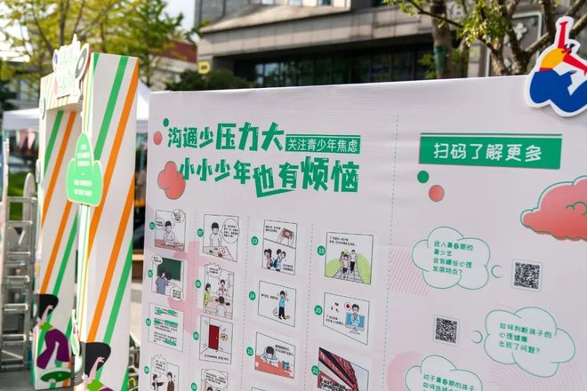 市集上,展出了由徐汇区精神卫生中心“精中小哥哥”科普团队原创的青少年心理健康科普内容。工作人员引导居民观看科普漫画和科普短视频,并进行简单的讲解,帮助更多人了解青少年的内心世界。