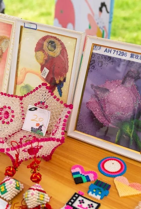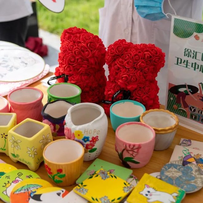 徐汇区精神卫生中心社工部和徐汇区13家街道(镇)阳光心园的摊位热闹非凡,展出精神康复者们制作的黏土冰箱贴、手绘扇面、串珠杯垫、手绘画框等一系列作品,琳琅满目的作品,吸引许多人驻足观赏。
