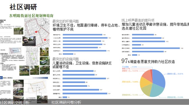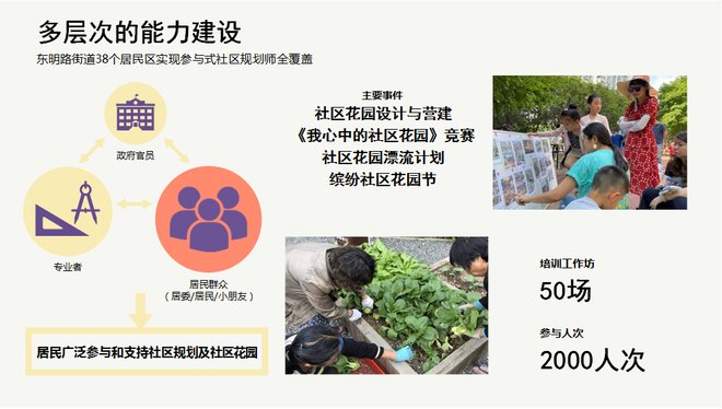 2020年,在东明路街道与同济大学、四叶草堂团队的合作引导下,东明路街道的居民们开始参与到社区花园的改造和建设中。当时,刘悦来和四叶草堂团队将社区花园与社区规划相结合,为街道做了个三年行动计划,覆盖街道的38个居民区。