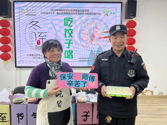 2021年12月20日星期一下午13:00,在正荣公益基金会“你好,社区”的资助下,上海金山区乐心公益发展中心(以下简称“乐心”)在金山卫镇正荣御首府开展“幸福社区·群众乐”的“冬至节气 包饺子咯”社区活动,此次活动主要是让社区居民体验冬至传统——包饺子,乐心希望通过本次活动的开展,让居民为社区的服务人员,包括居委会、物业、保洁、保安等送上一份爱心,感谢他们在这一年里的付出,同时也拉进社区服务人员与居民之间的距离。
