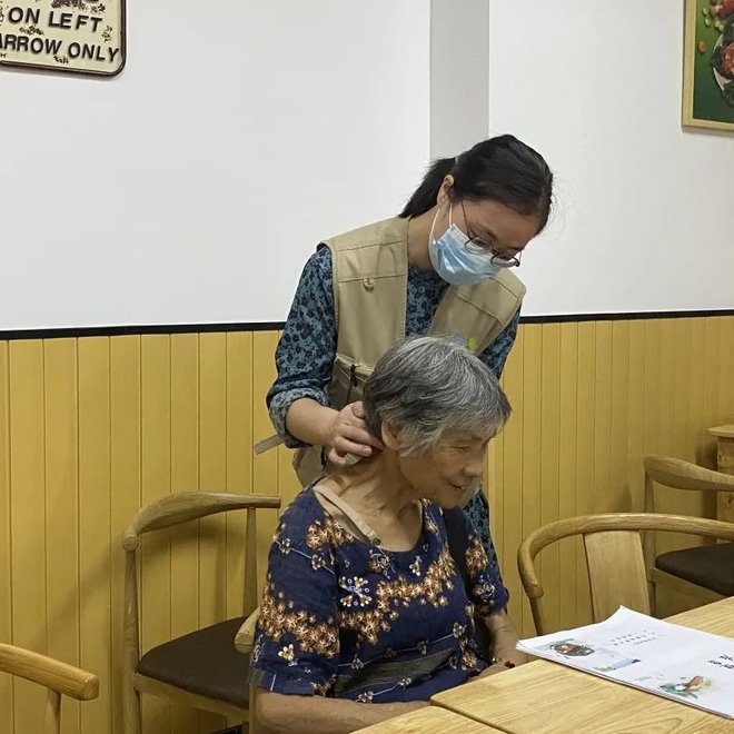 参与活动的老人中,不乏对中医有些许了解的,当医生介绍到劳宫穴、风池穴等,一位阿姨一下子准确找到了穴位,表示自己平时在家就会按摩保健,并热心地坐到前排,充当教学模特。