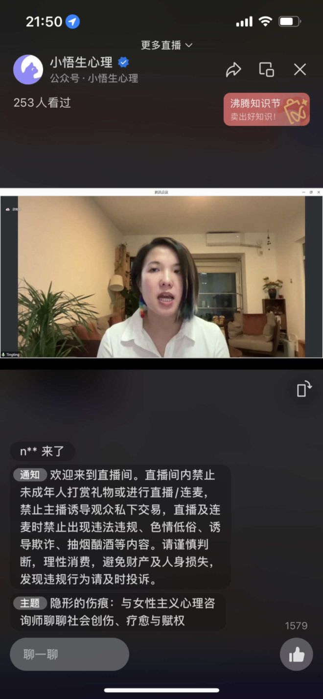 本次直播在腾讯会议直播,并在小悟生视频号上转发,腾讯会议的最高同时在线人数为100人,视频号上累计观看人数为253人。此次直播,我们有幸邀请到具有丰富咨询经验的重量级嘉宾韦婷婷老师。作为国家二级心理咨询师、广东省心理学会临床心理与督导专委会会员,老师帮助青年们认识我们所面临的社会创伤和微创伤,为伙伴分享如何帮助帮助来访者看到由创伤引起的心理问题,以及如何在个人内在和外在建立疗愈和自我赋权的方法。希望在主讲人女性主义视角的引领下,我们面临的那些社会创伤与微创伤,那些埋在过去之中的伤痕,都能够得到疗愈。