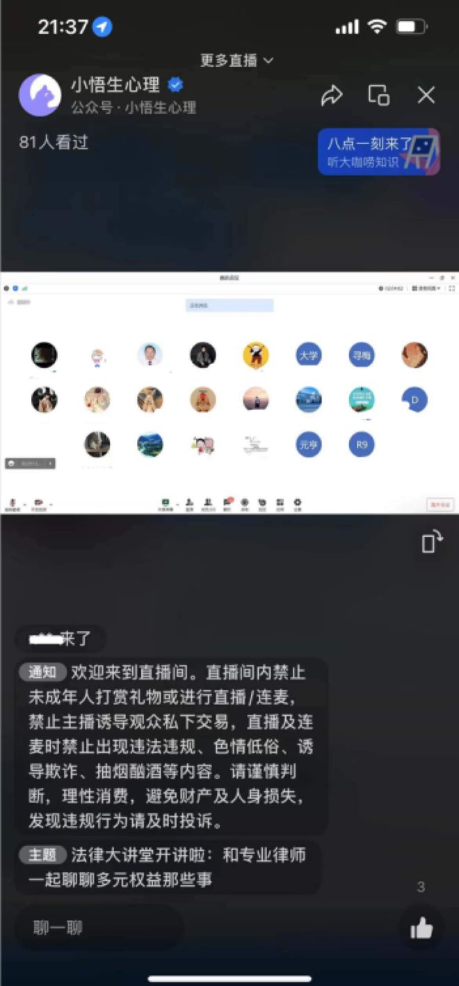 本次直播在腾讯会议直播,并在小悟生视频号上转发,腾讯会议的最高在线人数为35人,小悟生视频号上累计观看人数为81人。此次直播,我们有幸邀请到资深法律嘉宾刘巍律师。刘巍律师自1999年就开始致力于多元权益维护方面,拥有扎实的理论支撑与丰富的实践经验。刘巍老师以「理论」、「实践」双面旗帜作为引领,讲述了面对校园霸凌、职场霸凌我们该怎么应对,并且阐述了意定监护的理解与适用,以及发生共同财产纠纷时如何处理等问题。为我们在面对霸凌时提供保护自己的武器,在如何保障自我的权益、或者委托TA人监护方面增长相应的知识。希望纵使面临狂风骤雨,我们也能够在法律的防护罩下安然无恙。
