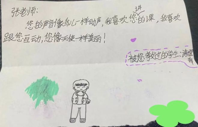 让豆子老师意外的是那些小惊喜。第二次上课前,一个扎马尾的女孩跑过来,塞给她一张折成小方块的纸条。打开一看,上面用彩笔写着:“老师谢谢你告诉我们这些。我以前很怕长大,现在不怕了。”