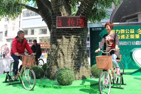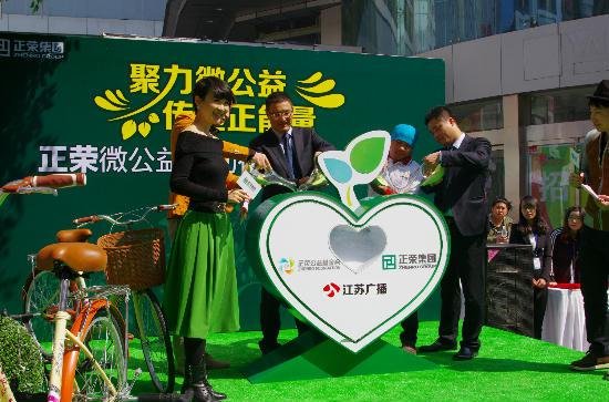 2014年3月22日,南京新街口,“聚力微公益、传递正能量”微公益捐助行动正式启动。本次活动由正荣公益基金会主办,江苏广播著名DJ邓煌、陆莹、安悦亲临现场,与南京部分草根公益组织代表及现场观众,通过骑行方式点亮代表正能量的正荣之树。