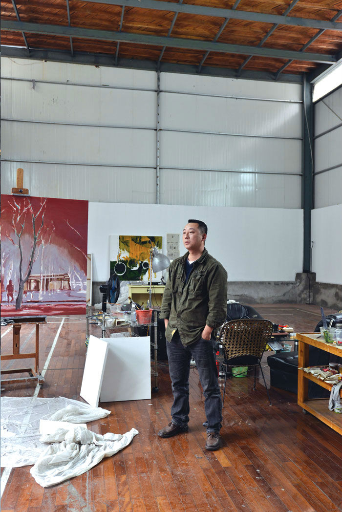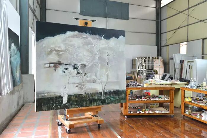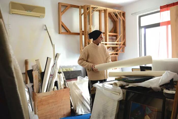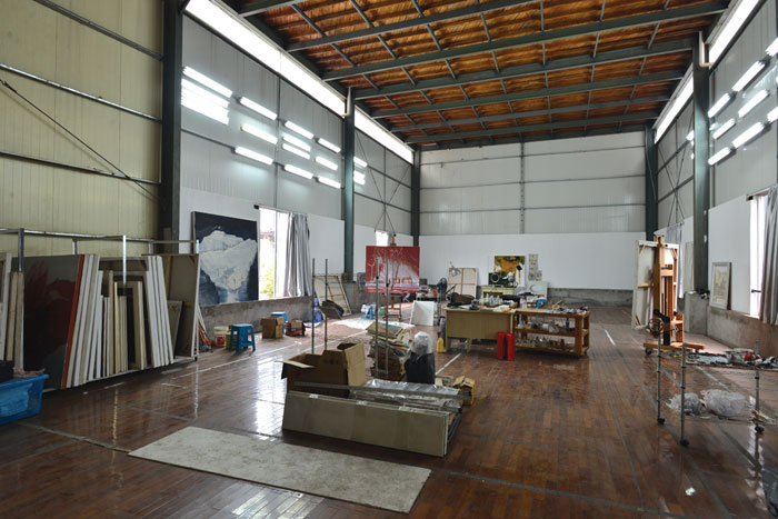 人人美术培训学校搬走之后,福建师范大学美术学院的老师林历,便与同是画家的妻子符莉将工作室搬进了原来的羽毛球馆,他看重的就是这里的空落跟简单,他们并不打算对工作室做太多的布置,仅有的家具是陪伴了多年的沙发和茶座,所有画作都一马平川地置地在眼前。他和妻子的画板各占一边,也没什么隔挡。对于他们来说,这里就是纯粹的创作空间。