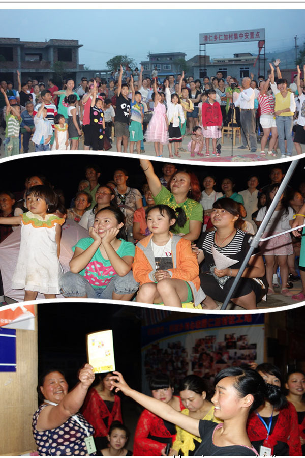 随着夜幕的逐步降临,越来越多的村民将活动场地围在了中间,几滴小雨落下根本不能阻挡广大村民的热情。而我们的活动也在心梦天使舞蹈队的《踏浪》声中终于开始啦!年轻的身影,动感的曲风、凉爽的晚风、热闹的场景,无一不透露着本次活动的主旋律,接下来便是由雅安市群团组织驻仁加村社工站站长段国蓉致开幕词,表达了在今后工作中自己要与社工站一起为仁加村村民谋福利、帮困解难,赢得了在做老百姓的阵阵喝彩。然后便是成都心家园仁加村社工站项目主管吕小英做南都公益基金会仁加村心融合项目结题汇报,在报告总结了自4•20以来,成都心家园仁加村社工站在南都基金会的大力支持下,进行了紧急救援、过渡安置以及灾后重建等环节,并在此过程中所作出的点点滴滴,同时也希望在今后的工作中能够得到更多村民对我们工作的指点建议,积极参与,肯定与鼓励。