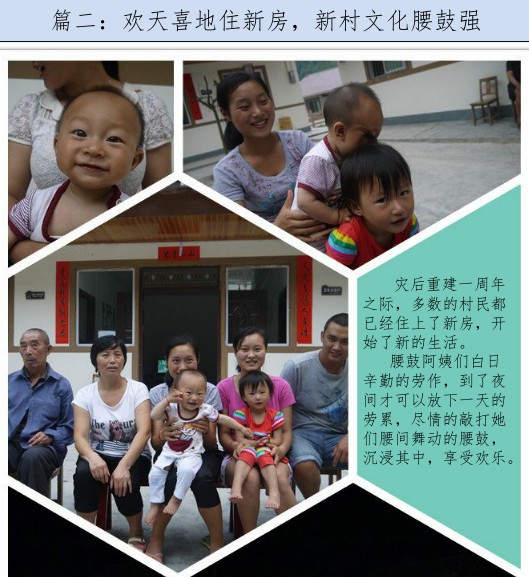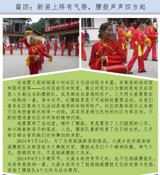 2014年5月,正荣专项救灾基金资助西安市泽众社区公益事业发展服务中心,开展“烟溪村灾后社区文化重建”项目。项目旨在恢复烟溪村社区民俗文化,通过组建腰鼓队和舞狮队开展活动,建立和谐的、健康的烟溪乐和社区。项目通过参与式手法,恢复以社区为本的文化——舞鼓和舞狮活动,同时逐步推动社区组织承担必要的减防灾职责,开展响应的减防灾活动。