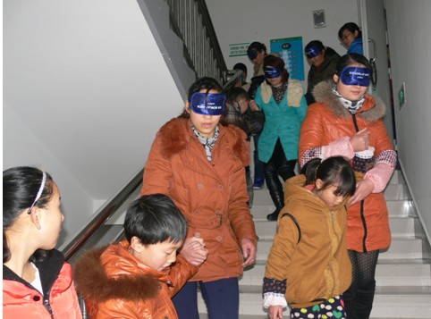 在这次工作坊上,首先安排家长们和孩子一起做了一个活动:用眼罩蒙上家长的双眼,让只有10来岁的孩子带领各自的家长穿越各种障碍,上下几十层台阶,最后安全回到教室。