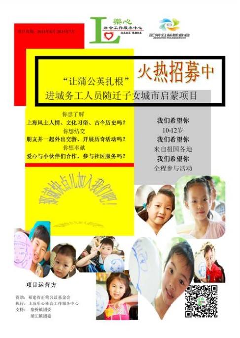 基于这样的背景,2014年9月,由正荣微公益支持的“让蒲公英扎根”进城务工人员随迁子女城市启蒙项目启动。项目将通过“我与上海”城市启蒙课堂、“上海人家”城市家庭历奇活动、“我为上海”社区志愿服务行动,为其敞开“了解上海·感受接纳·融入城市”的那扇窗。该项目由上海闵行区乐心社会工作服务中心执行,实施地为上海市闵行区浦江镇民工子弟学校,项目执行期为一年。