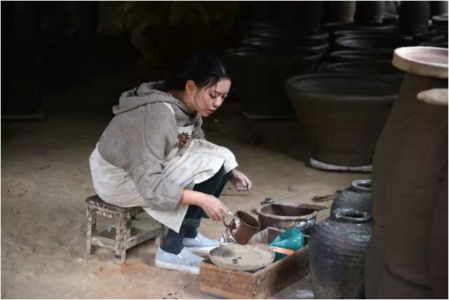 大陶,不能用拉坯机,师傅凭借手掌将泥块擀成泥条,靠左手掌心与右手虎口的力量将泥条一圈圈压挤成大器。师傅做大陶四十年,清早出工,傍晚手工,期间除了午饭,便是一直低头工作,偶尔抽根烟,就当作休息。每做一个坛子,师傅能赚4块钱,师傅每天能做30多个坛子。即便周末,师傅也在做工。