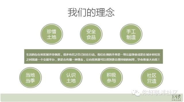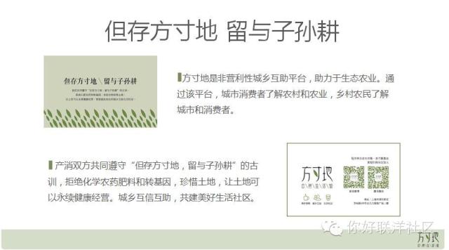 总而言之,做任何事情就是从“但留方寸地,留作子孙耕”这个理念为出发点。我们现在在做的是方寸地自然生活馆,我们在做一个城乡互助的平台。说白了就是让城市里的人和农户能够互相认识,反正就是一句话“我不想赚钱!”。经常有人问我怎么参加到这些活动,其实这个很简单,我看中你,我就会帮你,如果我看不中你,我一定不会帮你。我也不会从这里拿一分钱,我养家糊口不需要这点钱。说大一点就是为了自己的理想吧,为理想买单。