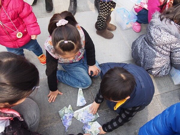 为了让小朋友们在活动过程中相处得更加自然,我们还给大家准备了简单有趣的热身小游戏——植物趣味拼图比比看。小朋友们都领到了当地植物图片的一小块,然后开展寻找和自己一样的小伙伴。参加活动的小朋友们年龄参差不齐,但是大家配合得很好,很快都把被打乱的植物组合成了原来的样子。